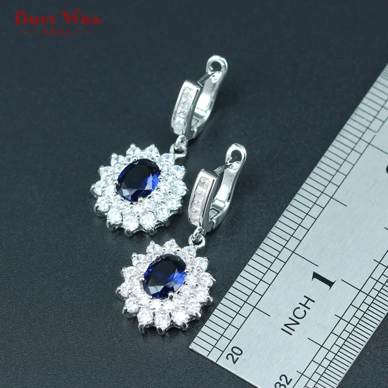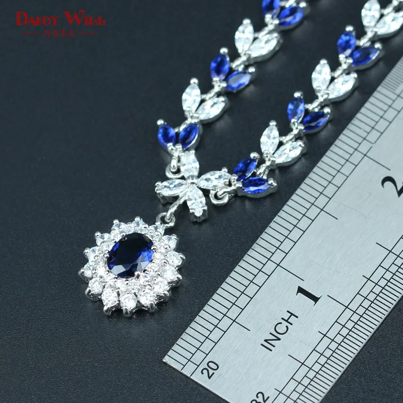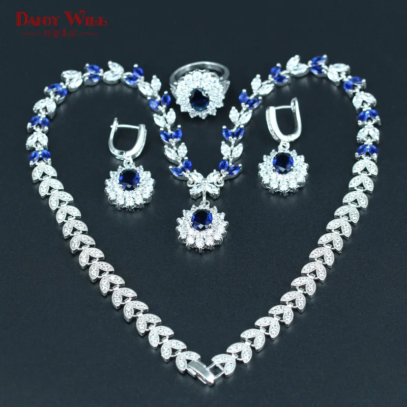 DANDY WILL Luxury Bridal Jewelry Set For Women Blue Crystal White Zircon Silver color Pendant/Neckl
