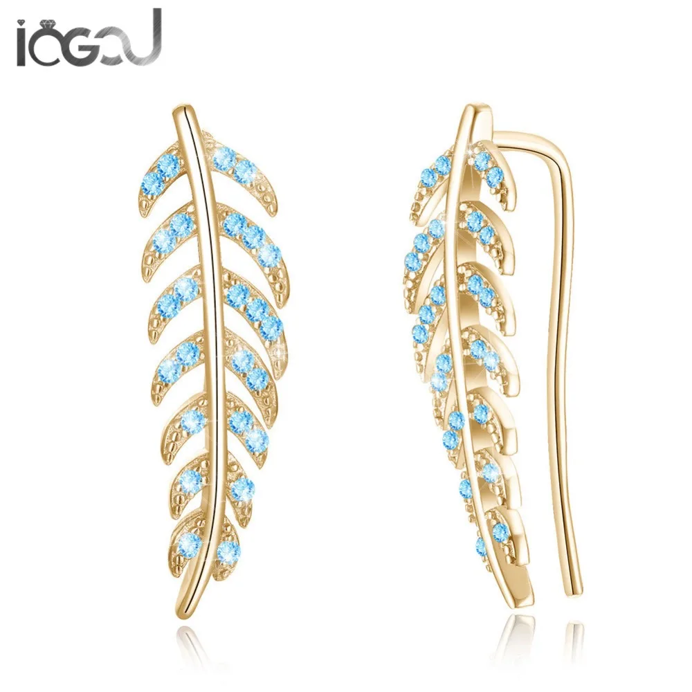 HIGH QUALITY IOGOU Yellow /White Gold Color 925 Sterling Silver Leaves Feather Stud Earrings With Solitaire CZ F